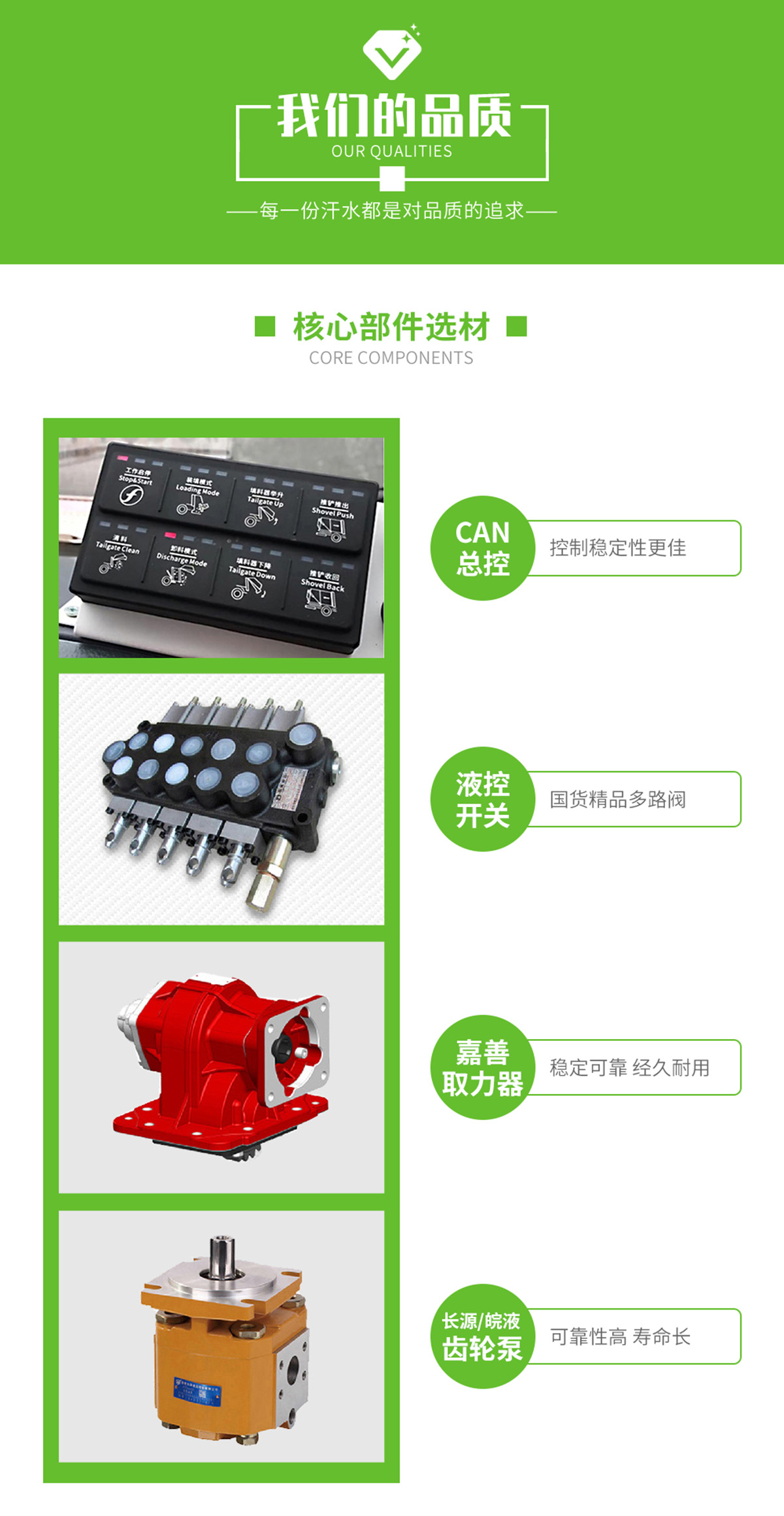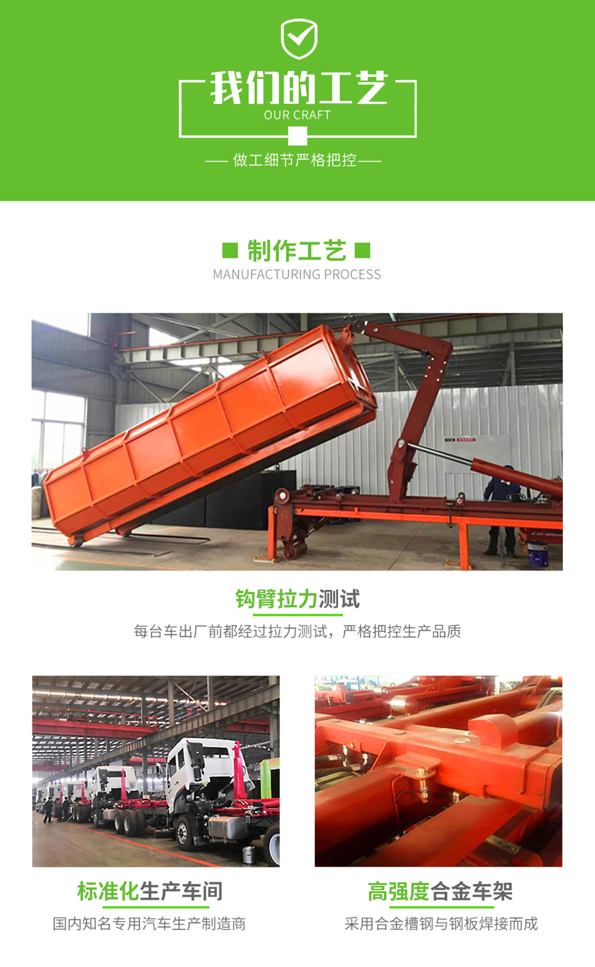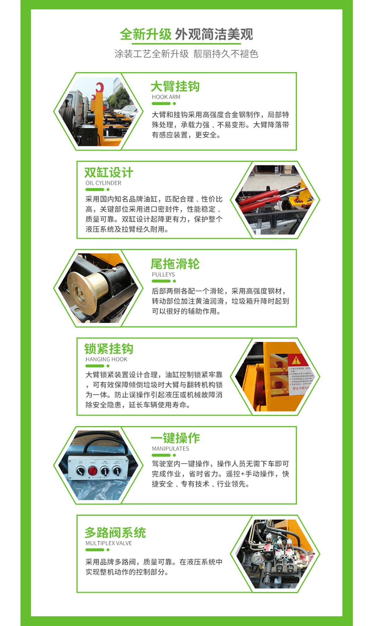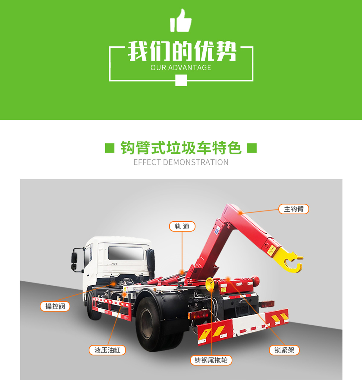 上裝配置:勾臂垃圾車標配:由液壓系統、操作系統、拉臂,組成。舉升油制缸為國內知名液壓件廠家生產的雙作用油缸,多路閥液壓控制,操作員手動控制垃圾廂吊上放下,帶自卸功能,上下一次工作循環時間≤40秒。垃圾箱冷板壓制垃圾箱,帶后門密封圈,帶金屬滾動輪。