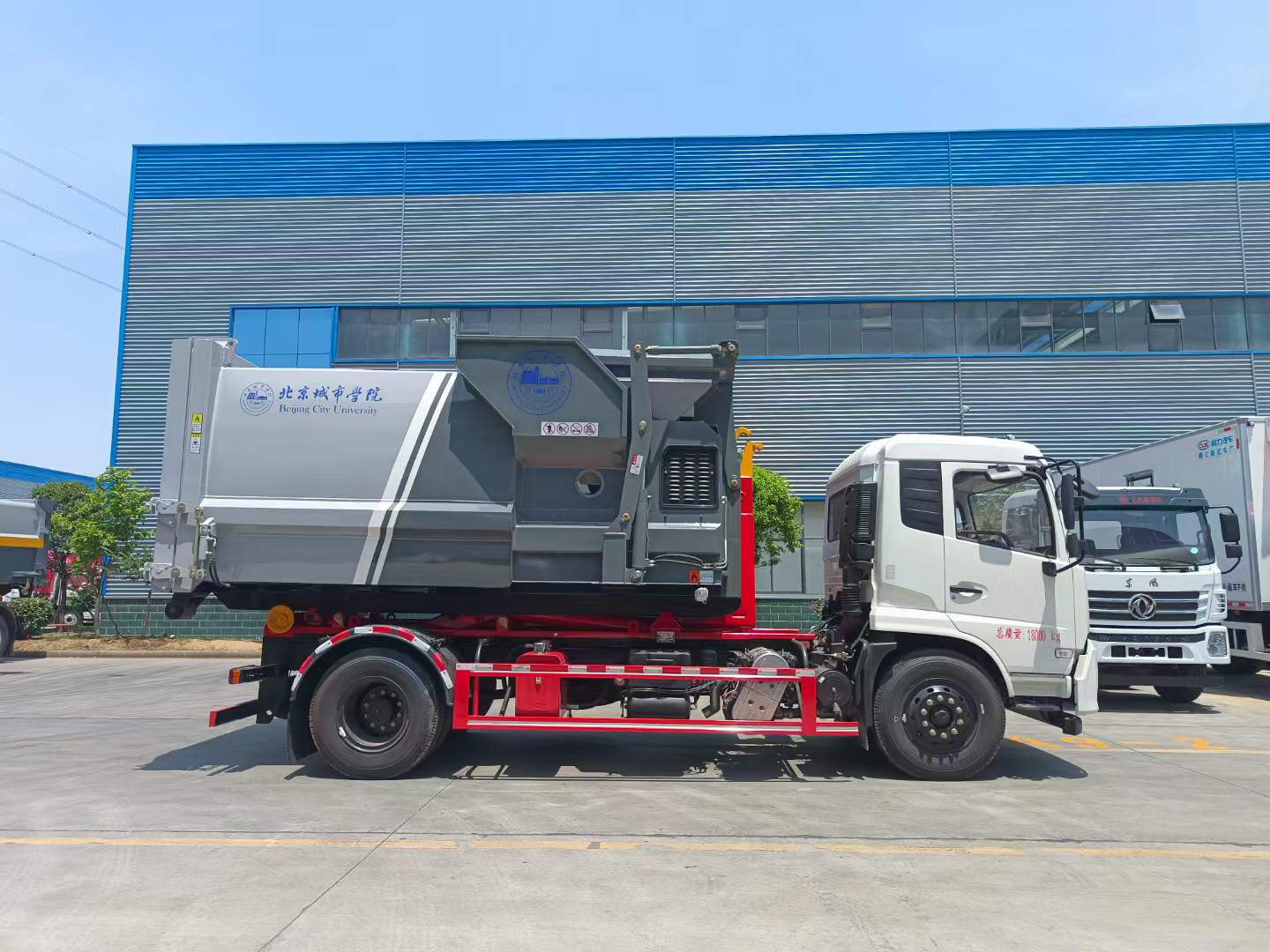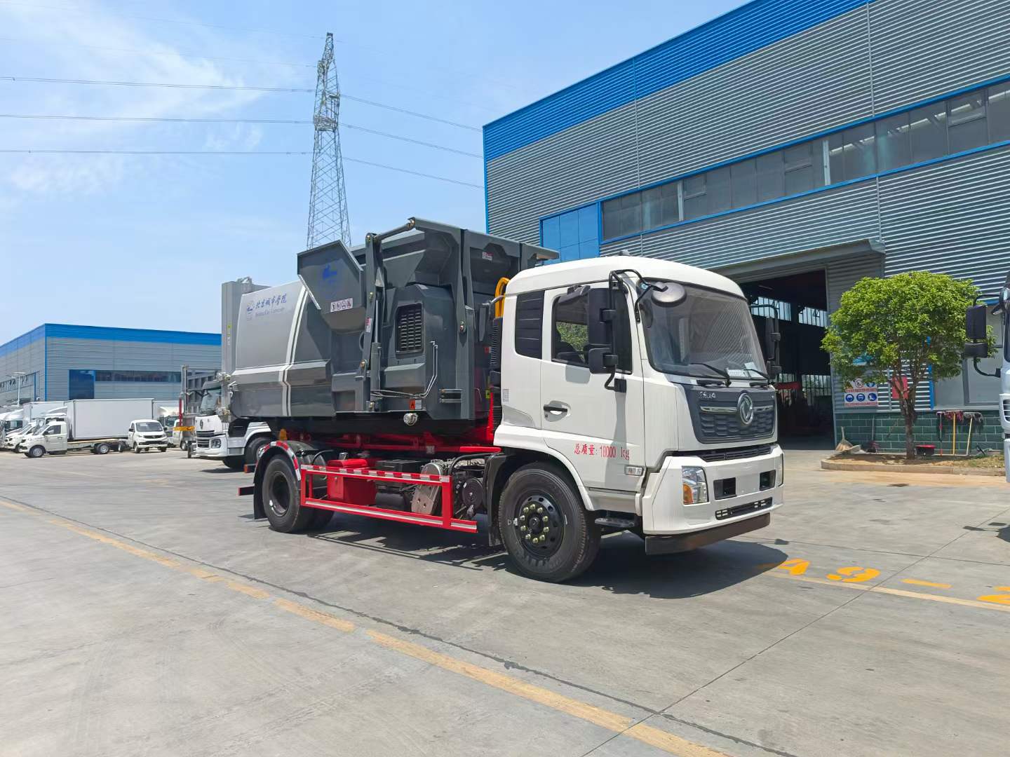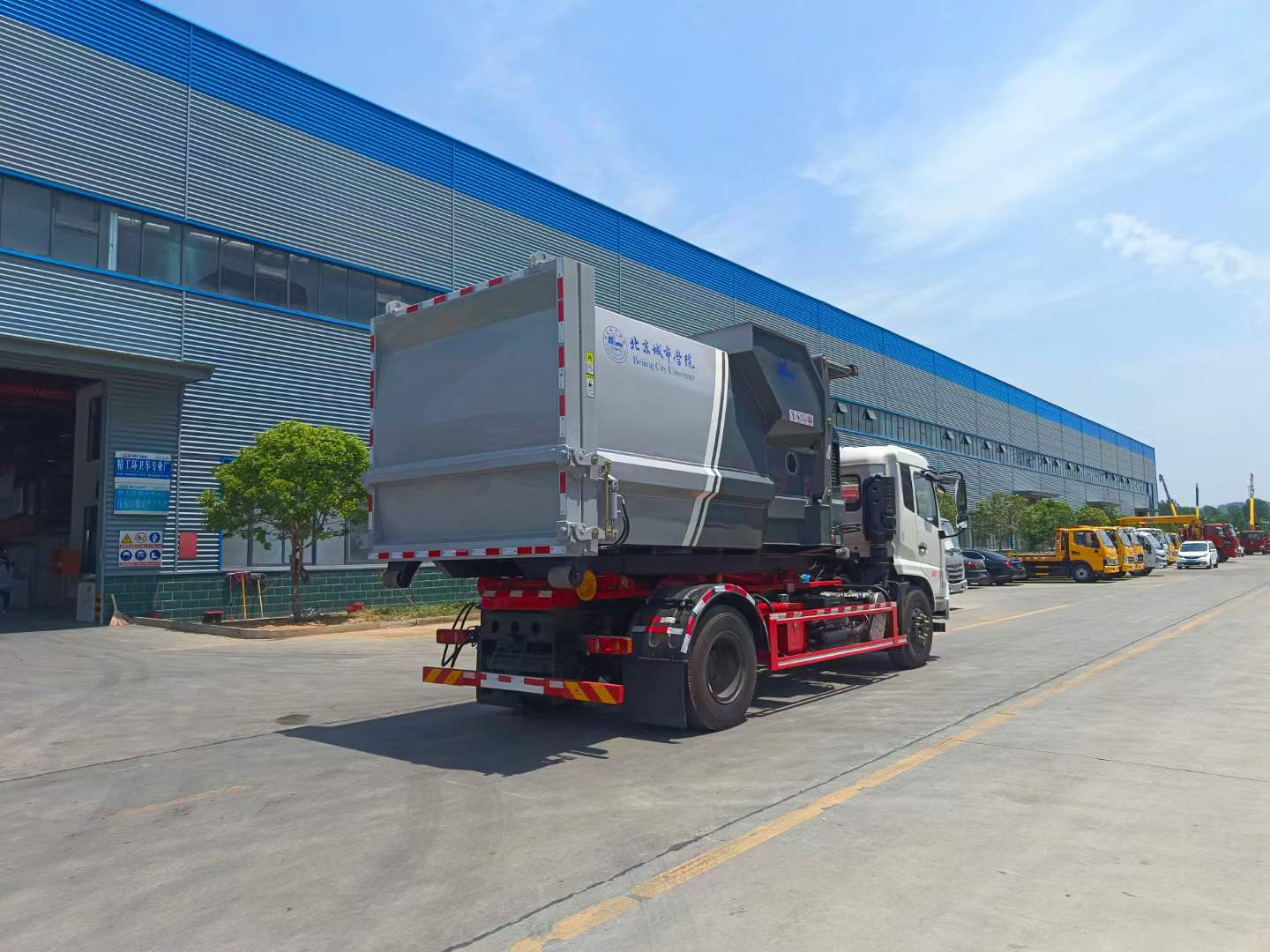 上裝配置:配套12~14方勾臂垃圾箱,主勾臂由高強度板材制作,雙油缸,國產多路閥,液壓油泵,標配駕駛室外部操作,可選裝駕駛室室內操作,選裝液壓后支腿,防誤操作,帶平衡閥,液壓鎖。